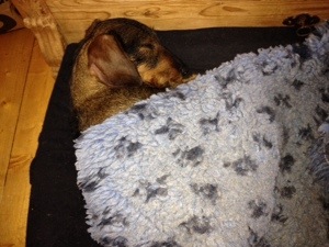 Efter långpromenad i skogen har Mollie bäddat ner sig i korgen. Hur mysigt är i te det?!?!